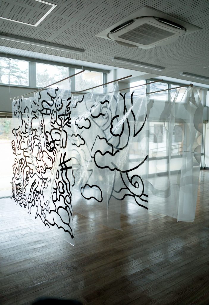 白蛇を思わせる線は、幾重にも交差し、時に浮かび上がり、時に奥へと沈んでいく。その動きは、語られる物語が聞く人によって異なる形を持ち、新たな解釈を生み出していく様子にも似ている。作品の中の線は、平面でありながら立体的にも感じられる。それは、広野町で出会った人々の言葉や感情が、私の中で折り重なり、形を変えていく過程そのものだった。また、作品に使用したシフォンの柔らかな質感は、伝説の中で竹女の乳母としての母性を象徴し、この土地が持つ穏やかで包み込むような空気を表している。